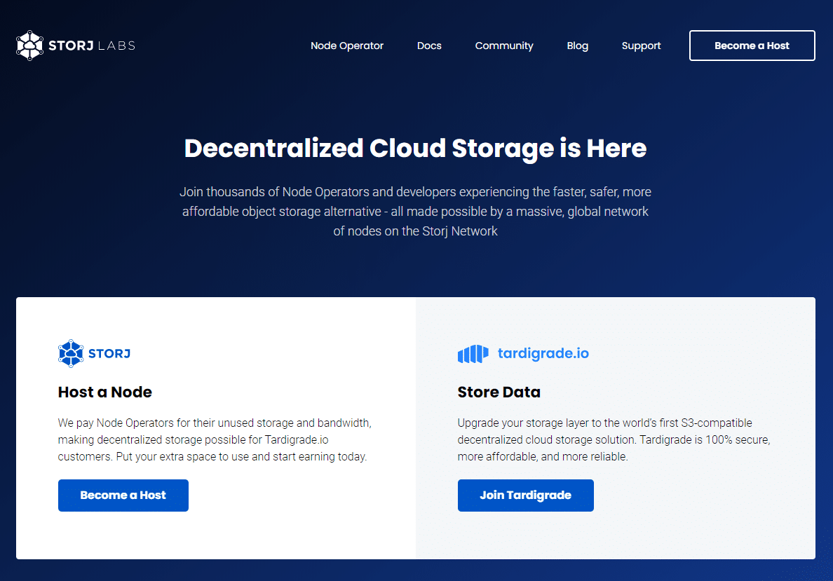 Storj, une entreprise proposant un cloud décentralisé, est un exemple de projet permettant de stocker et d’accéder à de très grandes quantités de données à faible coût. La société propose un réseau de particuliers mettant à disposition une partie inutilisée de leurs disques durs pour stocker des données contre rémunération via leur token basé sur le réseau ETHEREUM : le STORJ.