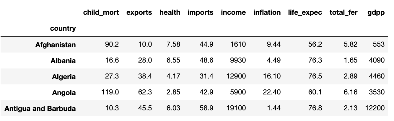 Pour illustrer le principe de l’ACP, nous allons prendre pour exemple un jeu de données nommé ‘country_data’ qui comme son nom l’indique regroupe plusieurs informations (PIB ; Revenu moyen ; Espérance de vie ; Taux de natalité/mortalité etc…) sur différents pays.</span>