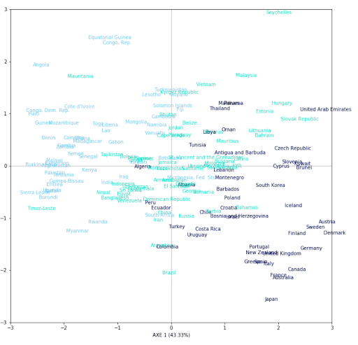 Notre représentation se faisant sur 2 axes, le cercle des corrélations est un outil pratique nous permettant de visualiser l’importance de chaque variable explicative pour chaque axe de représentation. La direction de chaque flèche indique l’axe expliqué par la variable et le sens indique si la corrélation est positive ou négative. On remarque que des variables comme ‘income’,’gdpp’ et ‘health’ sont corrélées positivement au premier axe alors que ‘<strong>child_mort’ ou ‘total_fer’ le sont aussi mais négativement. On peut alors s’intéresser à la représentation des pays dans les deux axes choisis par l'<strong>ACP et voir l’influence de la variable ‘life_expec’ sur leurs représentations.