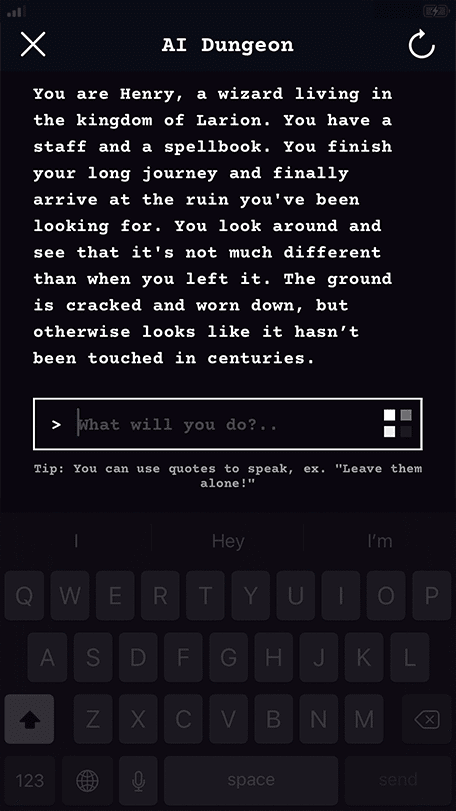 AI Dungeon est un jeu d’aventure textuel (ou fiction interactive) développé par Nick Walton, c’est-à-dire que le joueur va utiliser des commandes textuelles pour interagir avec environnements et personnages qui suivent une certaine narration.