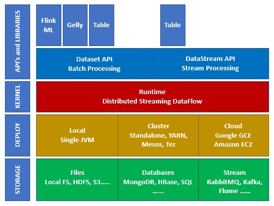 - Storage (stockage) : Flink dispose de plusieurs possibilités pour lire / écrire les données, telles que HDFS (Hadoop), S3, en local, Kafka, et bien d’autres