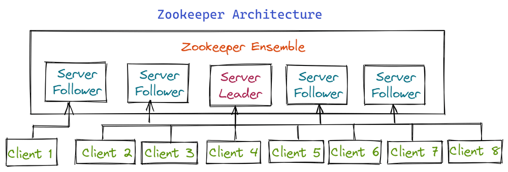 ZooKeeper suit une architecture « client-serveur« , où les serveurs sont des noeuds qui fournissent un service et les clients sont les noeuds qui utilisent ce service. Décrivons chaque élément du diagramme ci-dessus.