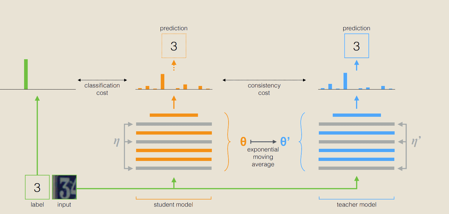 La méthode The Mean Teacher est constituée de deux modèles : le modèle élève et le modèle enseignant. Pour effectuer la classification de données avec cet algorithme, on commence par effectuer un apprentissage supervisé avec les données labellisées à notre disposition sur le modèle élève. Durant cet apprentissage, l’objectif comme on le sait consistera à minimiser le coût de classification comme on peut le voir sur la figure ci-dessus. Au terme de cet apprentissage supervisé, on va envoyer le jeu de données non labellisées à notre modèle et c’est à ce niveau que le coût de consistance et la moyenne mobile exponentielle interviennent.