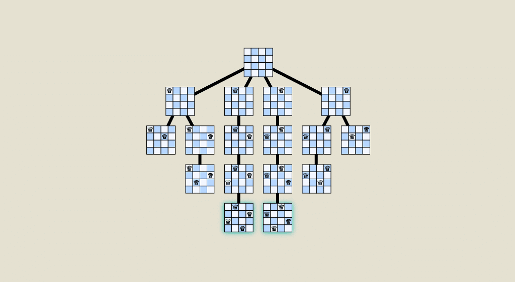 Étape 2 – Validation : Après avoir fait un choix, l’algorithme vérifie que les contraintes du problème sont toujours respectées. Si c’est le cas, il retourne à l’étape 1 afin de continuer le parcours en profondeur. Si ce n’est pas le cas, il revient en arrière (backtrack) pour essayer une autre alternative. C’est une des différences avec les algorithmes de résolution par force brute basiques, le backtracking peut éliminer des branches sans avoir besoin de les explorer jusqu’au bout.