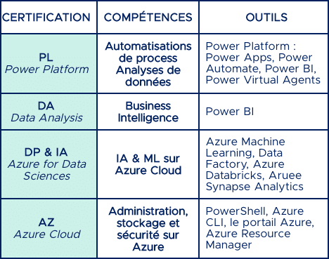 Pour attester d’un niveau d’expertise sur les outils développés par Microsoft, l’entreprise américaine a créé des certifications qui attestent d’un niveau d’expertise sur chaque outil. Ces certifications sont très utiles pour les entreprises, car elles permettent d’instaurer une nomenclature universelle et ainsi faciliter la formation et le recrutement des équipes. Une bonne connaissance de ces outils, particulièrement Power BI et le cloud Azure, est essentielle pour les Data Analysts, Data Engineers et Data Scientists. En effet, cette compétence représente un atout non négligeable dans une candidature pour un poste en data dans une entreprise ayant déjà déployé ces solutions.