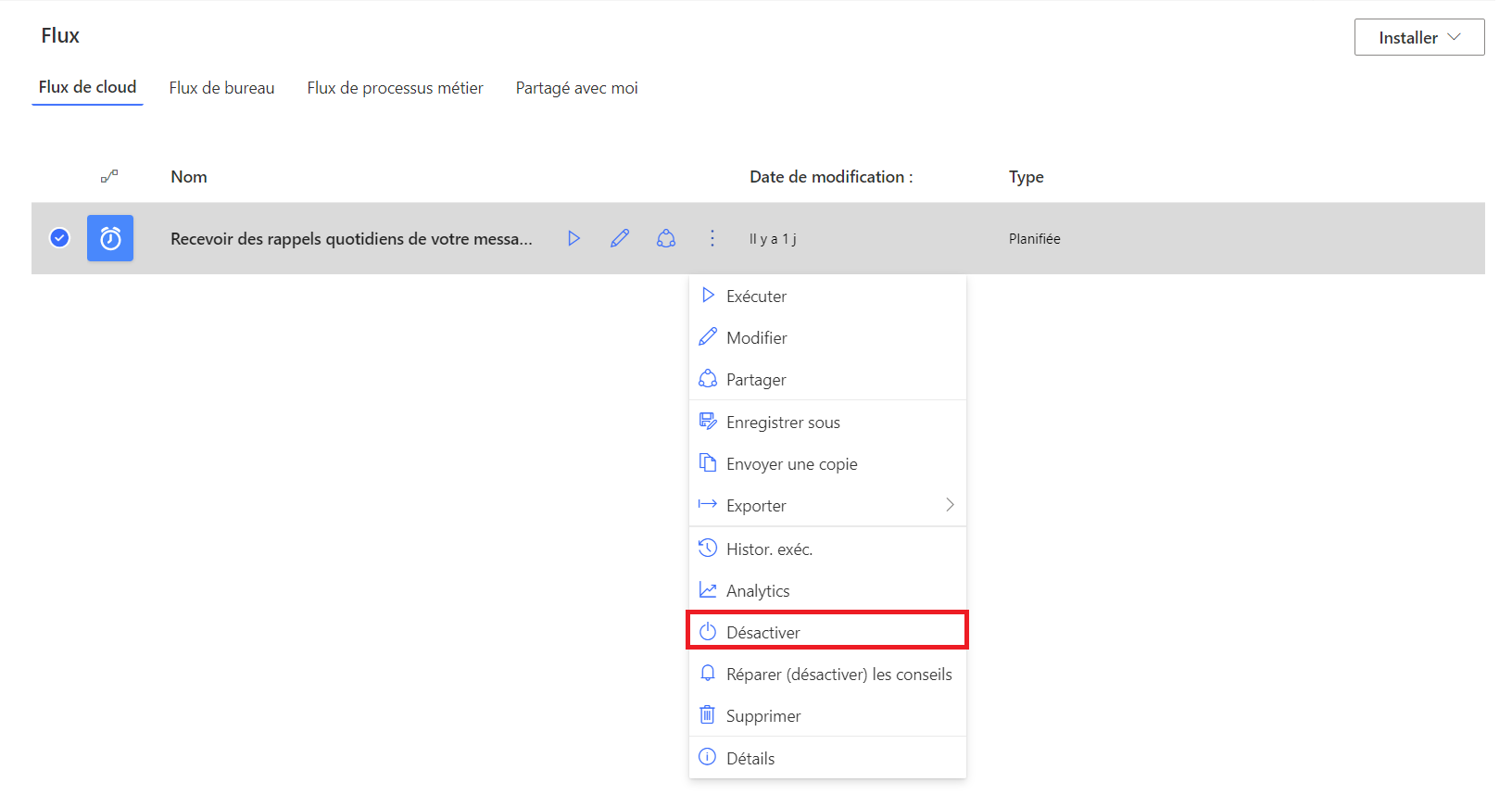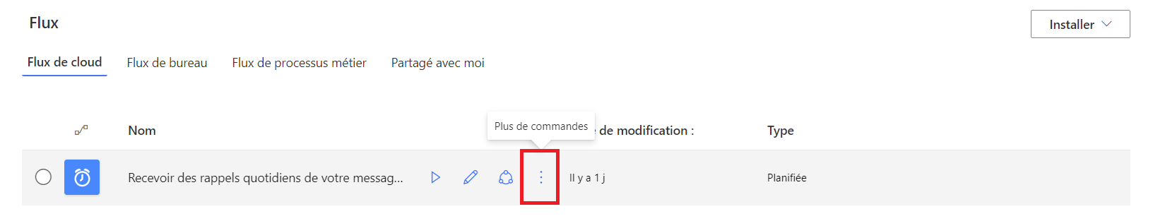 Notre flux apparaît ! En passant la souris sur notre flux « Recevoir des rappels quotidiens de votre messagerie » une petite icone play s’affiche avec le mot Exécuter :
