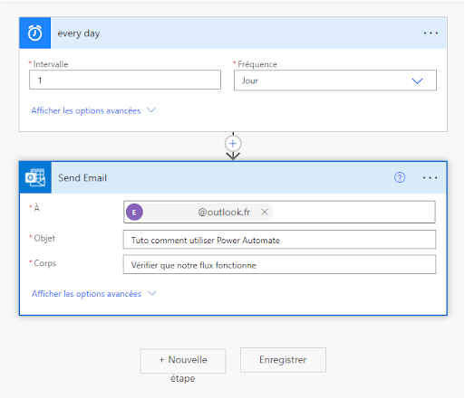 On choisit l’adresse mail sur laquelle vous souhaitez recevoir le mail, comme Objet : Tuto comment utiliser Power Automate et comme Corps : Vérifier que notre flux fonctionne.