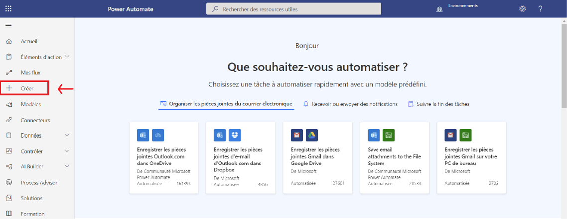 Rappelez vous, on cherche à créer un flux permettant de recevoir des rappels quotidiens sur notre messagerie Outlook ! On va donc cliquer sur « Créer »