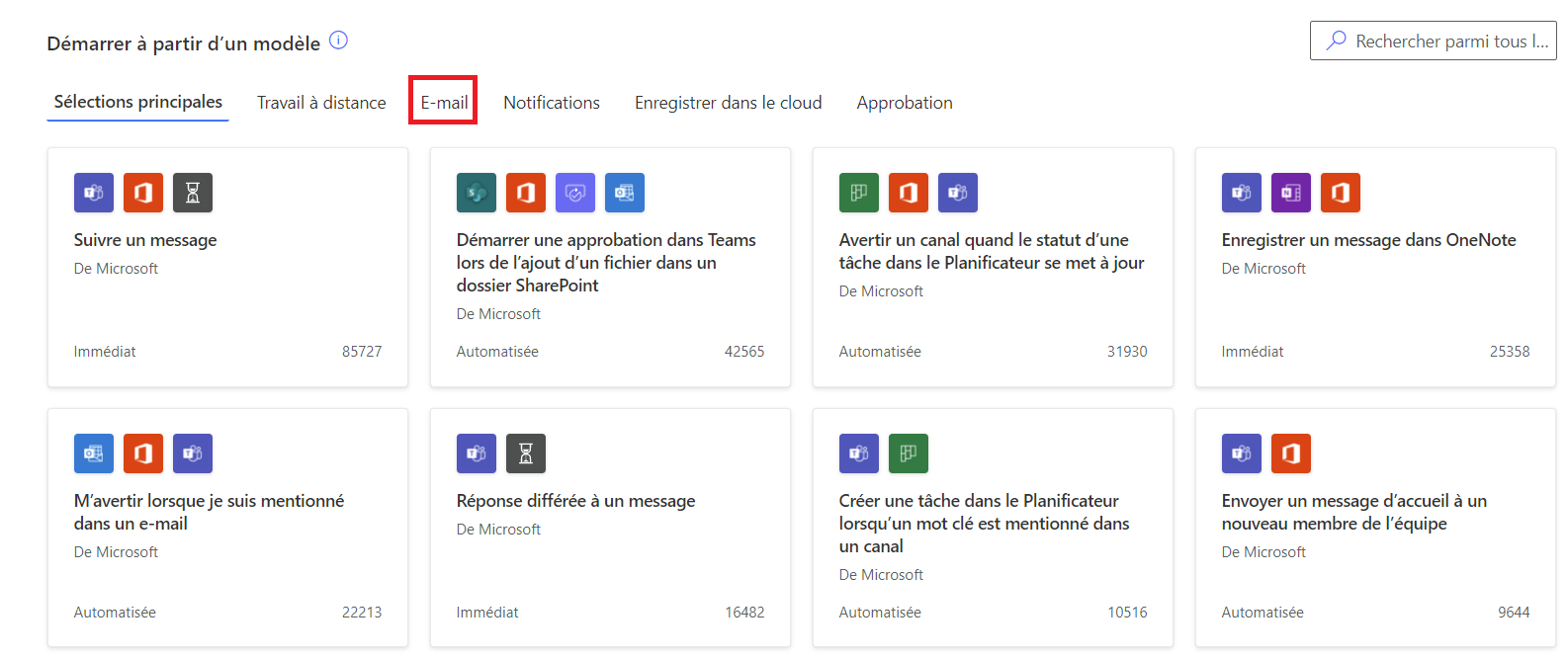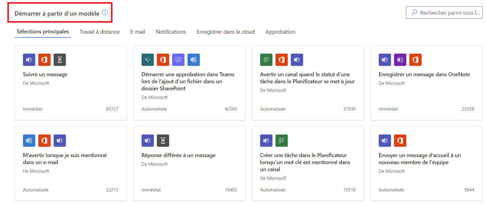 - Démarrer à partir d’un modèle : Cela permet à partir du modèle prédéfini de créer des flux puis de les personnaliser. Les modèles sont organisés suivant les besoins : Travail à distance, Email, Notifications…