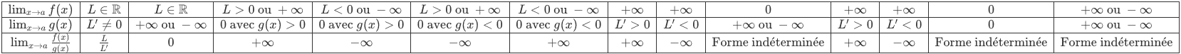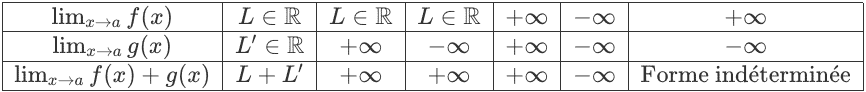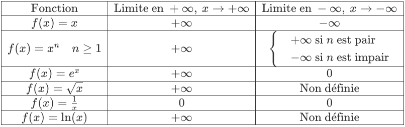 Ci-dessous, un tableau résumant les limites de fonctions usuelles à l’infini