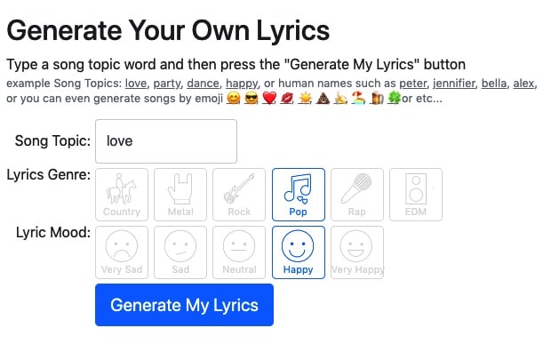 Certains outils, tels que ‘These Lyrics Do Not Exist’ permettent de générer aléatoirement un refrain, deux couplets et deux ponts pour 6 genres musicaux et 5 humeurs prédéfinies. Il vous suffit juste de préciser un thème avec un mot, une phrase ou un emoji, et l’outil fait tout le travail à votre place.