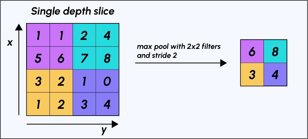Le Max-Pooling est un processus de discrétisation basé sur des échantillons. Son objectif est de sous-échantillonner une représentation d’entrée (image, matrice de sortie de couche cachée, etc.) en réduisant sa dimension. De plus, son intérêt est qu’il réduit le coût de calcul en réduisant le nombre de paramètres à apprendre et fournit une invariance par petites translations (si une petite translation ne modifie pas le maximum de la région balayée, le maximum de chaque région restera le même et donc la nouvelle matrice créée restera identique).