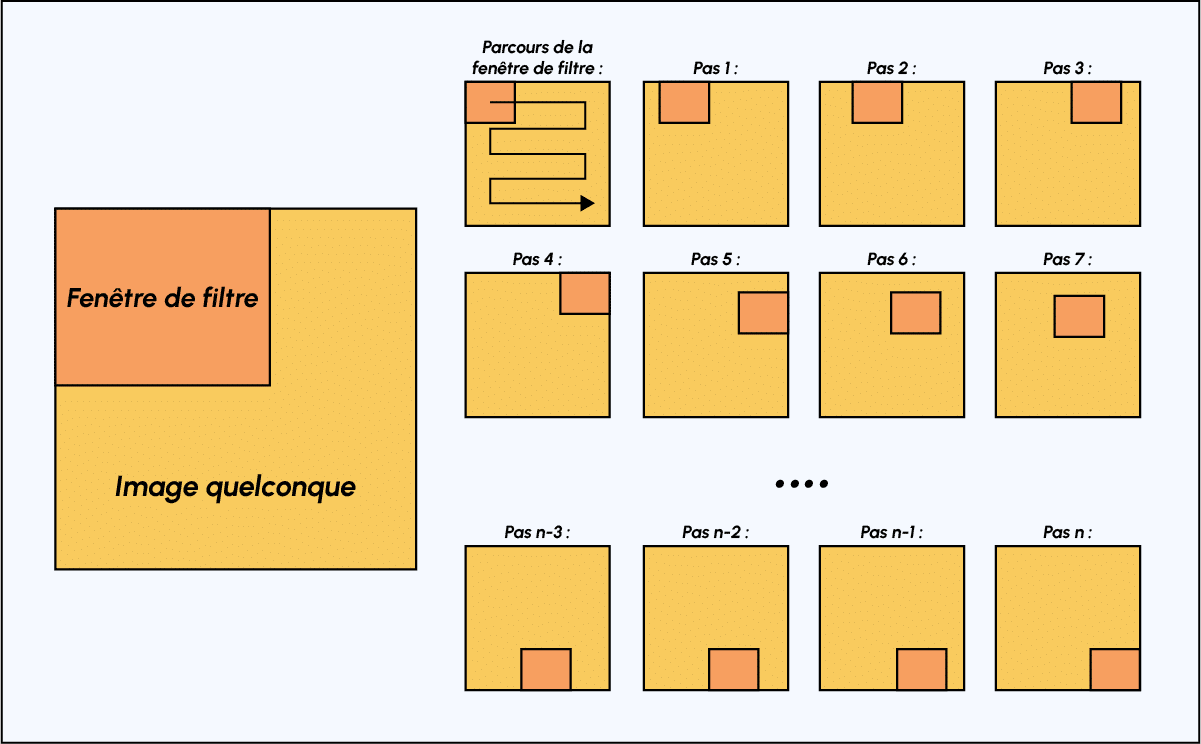 - La fenêtre de filtre, représentant la feature, se déplace progressivement de la gauche vers la droite d’un certain nombre de cases défini au préalable (le pas) jusqu’à arriver au bout de l’image.