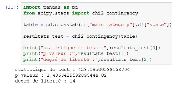 En Python le test est facilement implémentable à l’aide de la bibliothèque scipy et de sa fonction chi2_contingency. Elle permet d’obtenir rapidement la p-valeur du test ainsi que la statistique et le degré de liberté associé. Dans la pratique le test du khi-deux demande, en amont, un petit travail sur les données. Pour pouvoir effectuer le test il faut d’abord déterminer la table de contingence. C’est un tableau de croisement entre les modalités des deux variables. Il s’obtient facilement avec la fonction crosstab de Pandas. Ensuite on réalise le test en utilisant la table de contingence :