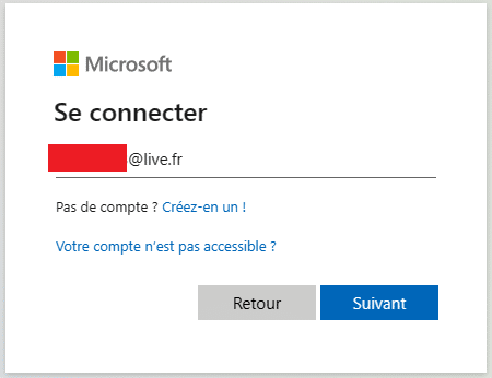 Ici, il faut renseigner une adresse Microsoft (@live.fr, @hotmail.fr, etc.) personnelle, puis renseigner le mot de passe.