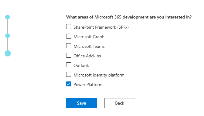 Puis, il est demandé de préciser les éléments qui nous intéressent le plus sur Microsoft 365. Choisir au minimum « Power Platform », car Power BI en fait partie.