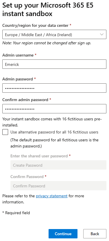 À la place, on va choisir la première option « Instant sandbox » qui va créer l’environnement avec tout un ensemble d’éléments préconfigurés (utilisateurs avec leurs emails, attribution de licences, etc.).