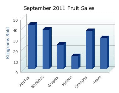 Les graphiques à barre en 3D sont par exemple souvent une perte de temps et d’information, car plus difficile sur l’œil. En effet la 2D rend plus facile la comparaison entre plusieurs barres sans piéger l’œil. Dans le graphique ci-dessous, difficile de savoir si les bananes et les oranges sont au même rang…