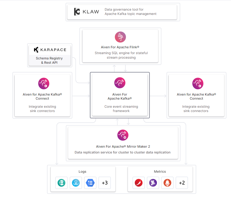 - Aiven for Apache Kafka ist das Grundgerüst für das Streaming von Daten, um sie in Echtzeit für jede Organisation zu transportieren. Es ermöglicht die zuverlässige Verwaltung, Nutzung und den Transport von Datenströmen.