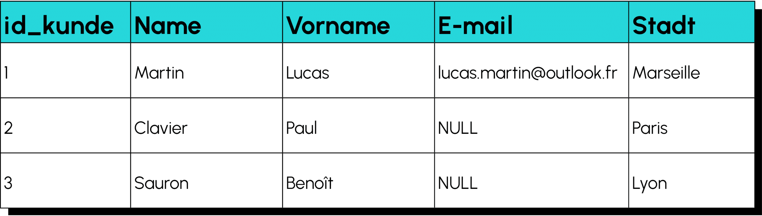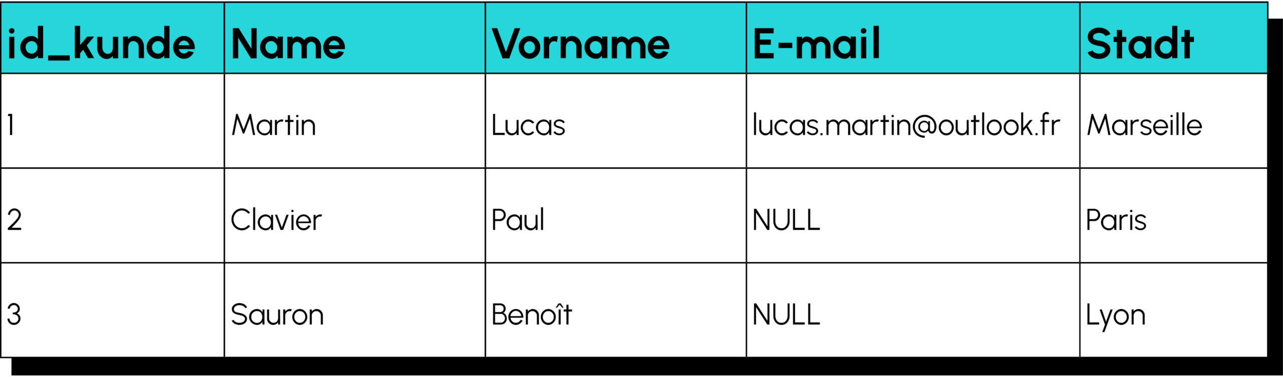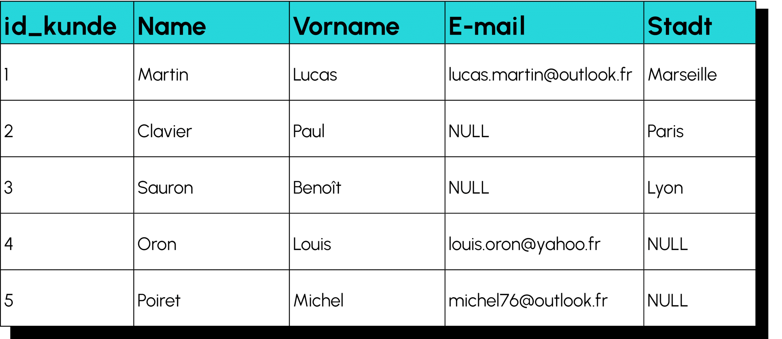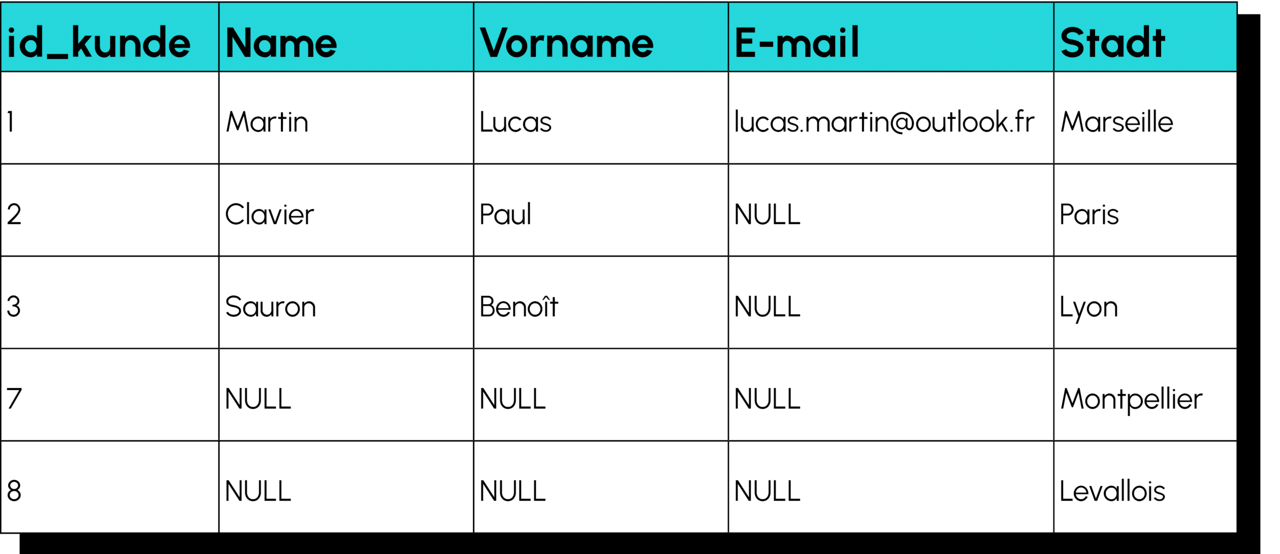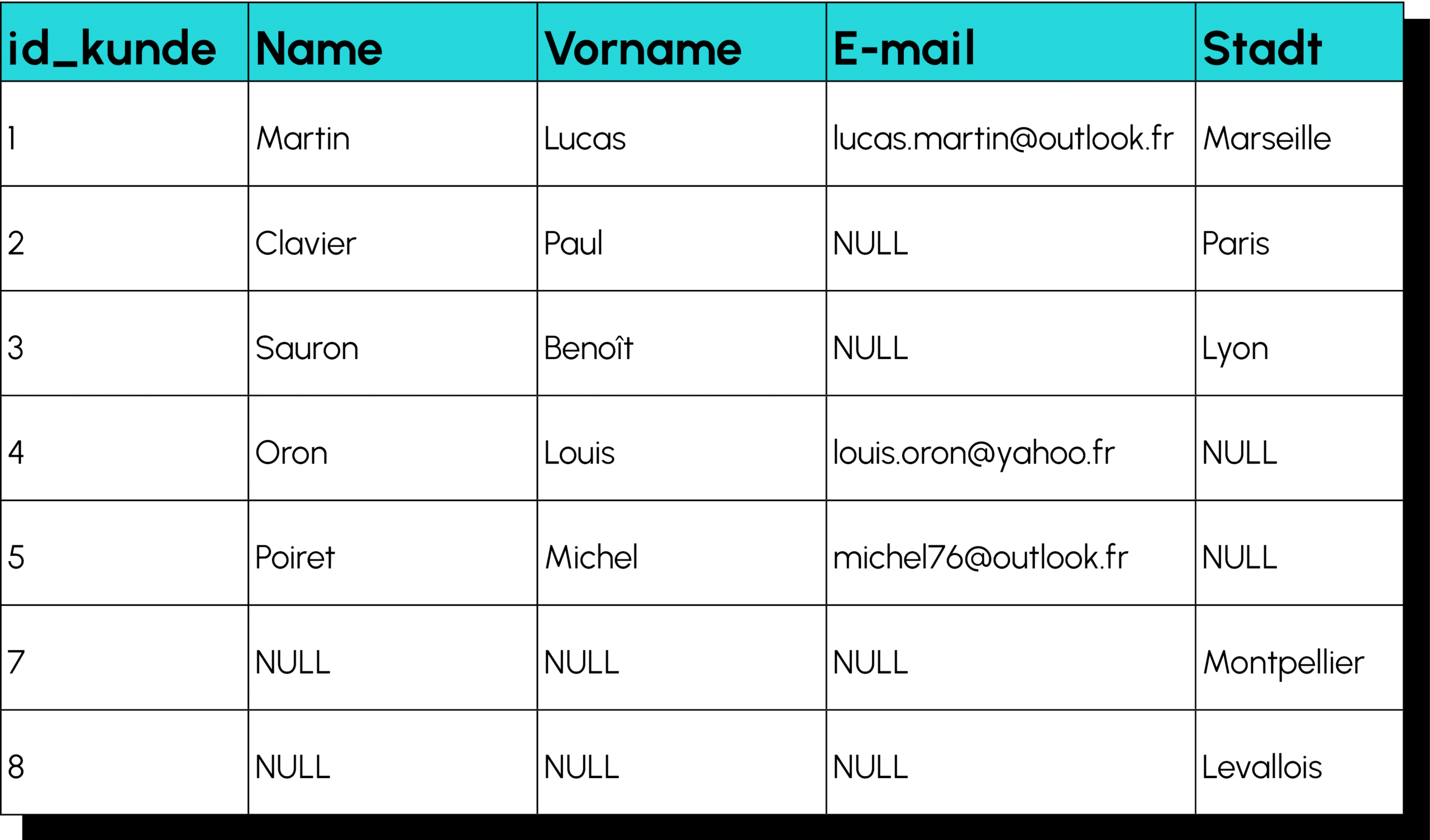 - Die Tabelle Stadt (franz.: ville) zeigt die Städte, in denen der Kunde (franz.: client) lebt, der id_client entspricht