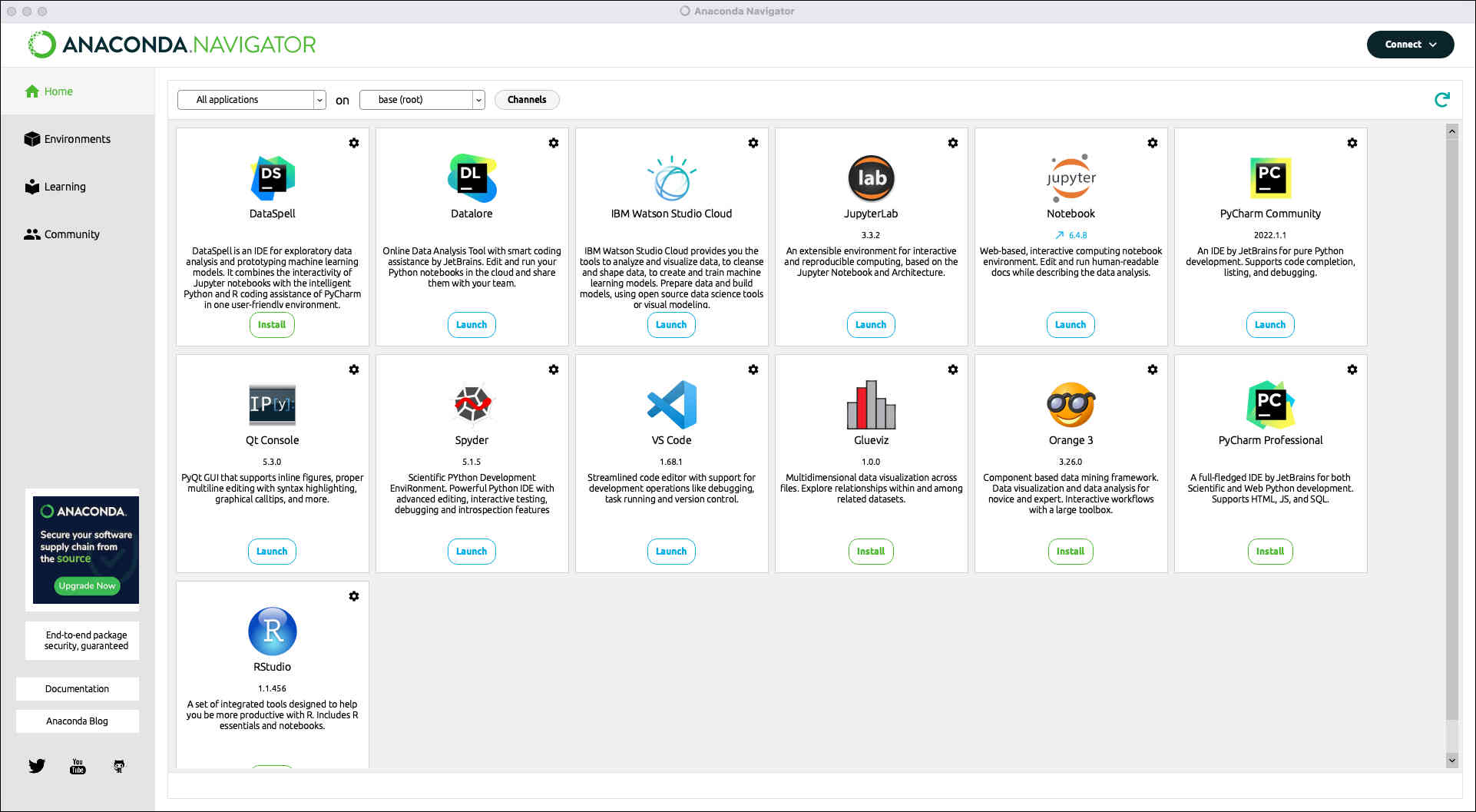 - Die Installation von Python-Paketen: Zur Erinnerung: Pakete sind zusätzliche Funktionen im Code. Anaconda Navigator ermöglicht es dir, effizienten und leistungsstarken Code zu schreiben (besonders nützlich, wenn du mit Machine Learning arbeitest), ohne dass du dir komplexe Befehle merken musst. Außerdem verwaltet die Plattform diese Pakete, indem sie sie aktualisiert und entfernt.