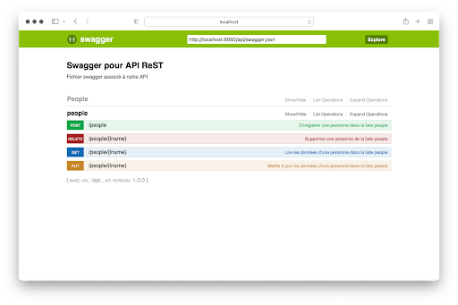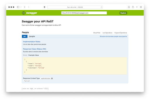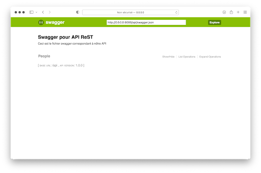 Die vorherige Schnittstelle ermöglicht den Zugriff auf die Dokumentation in der Datei swagger.yml und die Interaktion mit allen URLs, die die CRUD-Funktionen der API implementieren.