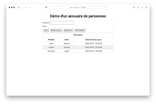 Die REST-API, die wir bauen werden, wird es ermöglichen, ein Personenverzeichnis zu manipulieren, wobei die Personen durch ihre Nachnamen identifiziert werden. Aktualisierungen werden mit einem „Timestamp“ (Datum/Uhrzeit) markiert.