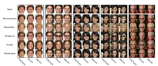 Die Bearbeitung von Gesichtsattributen, auch Facial Attribute Editing genannt, bezeichnet alle Methoden, die zum Ziel haben, ein oder mehrere Attribute eines bestimmten Gesichts zu verändern. Vor dem Aufkommen von Deep Learning war dies eine mühsame Aufgabe, da sie Pixel für Pixel von Hand durchgeführt wurde. Seit kurzem gibt es jedoch neue Algorithmen, die es ermöglichen, diese Änderung zu automatisieren. Wir werden hier das AttGAN-Modell näher betrachten, das zu diesen Algorithmen gehört, die auf neuronalen Netzen basieren. Dieser Algorithmus nimmt als Parameter das Gesicht, das wir verändern wollen, sowie einen binären Attributvektor und gibt das veränderte Gesicht mit den gewünschten Attributen zurück. Beispiele für seine Funktionsweise werden unten gezeigt:
