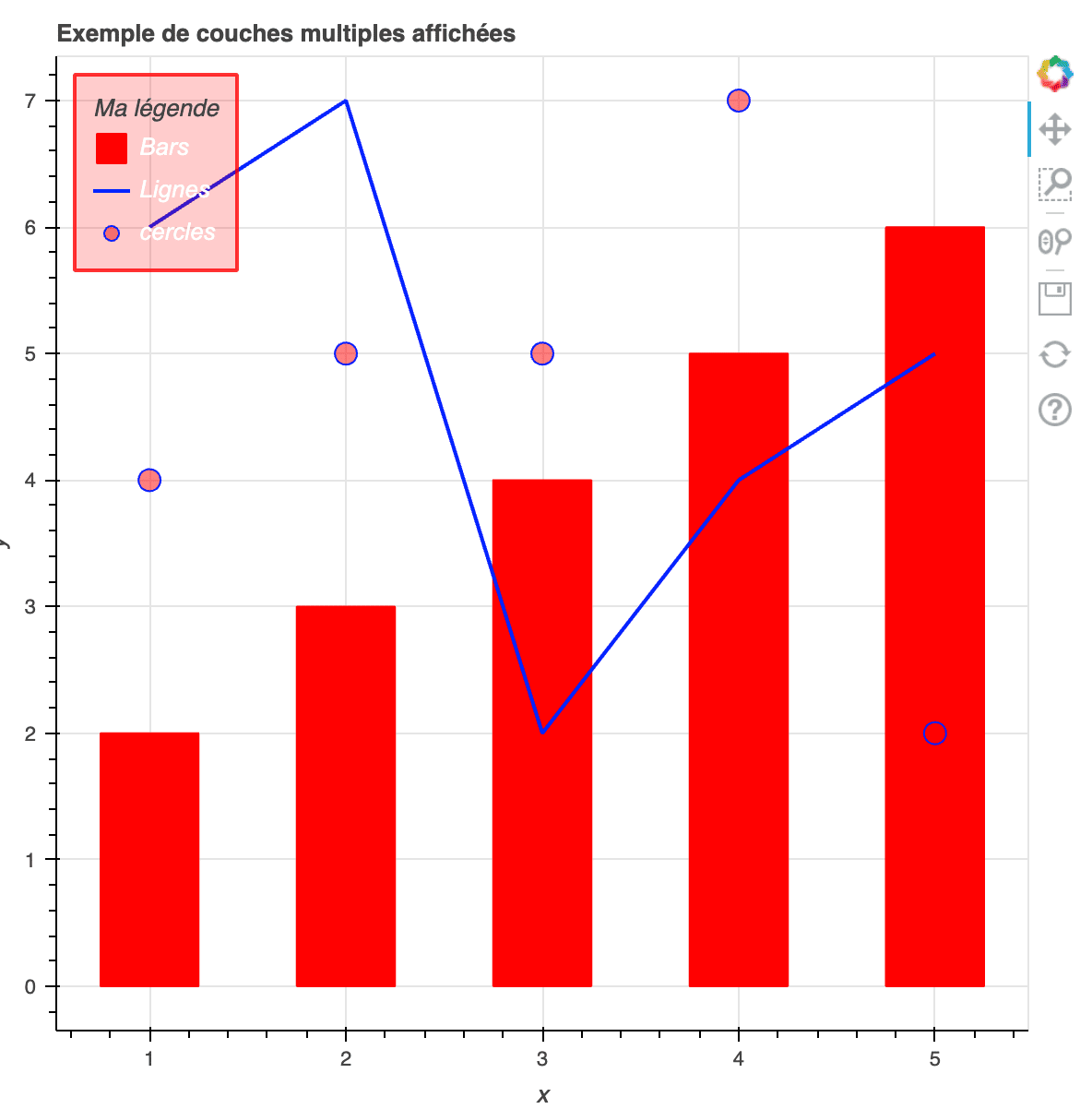 Aus praktischer Sicht ist Bokeh einfach zu erlernen. Es basiert auf einem System von zusätzlichen Ebenen, die während der Ausführung des Codes hinzugefügt werden. So können wir, nachdem wir unsere Figur erstellt haben, einen neuen Plottyp hinzufügen, indem wir diese neue Ebene über den bestehenden Graphen legen.