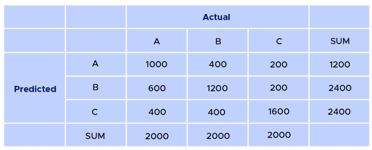 - Bei den Individuen der Klasse B wurden 1.200 von 2.000 tatsächlich als zu dieser Klasse gehörig identifiziert.