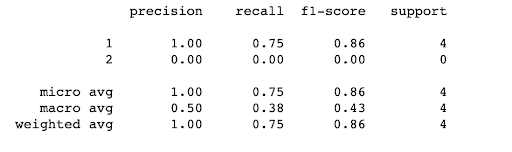 In unserem Fall kann man eine Genauigkeit von 0 für die Klasse 1 beobachten. Das liegt einfach daran, dass keine Person aus der tatsächlichen Klasse 1 als Mitglied dieser Klasse vorhergesagt wurde. Im Gegensatz dazu haben die Individuen der Klasse 2, bei denen 2 von 3 Individuen, die der Klasse 2 zugeordnet wurden, richtig zugeordnet wurden, eine Genauigkeit von 0,67.