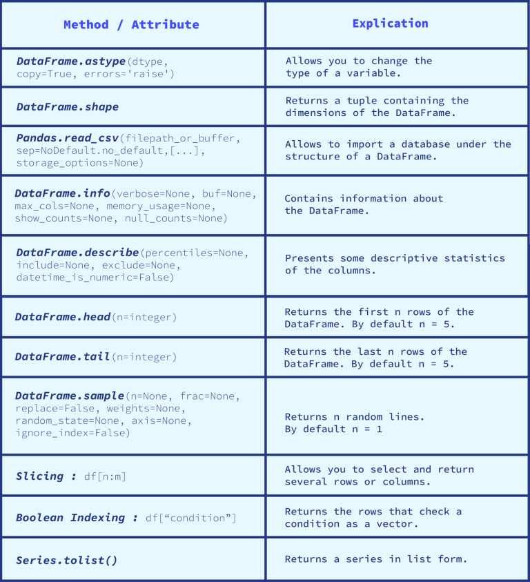 Ein Data Frame ist eine Reihe von Pandas Series, die durch einen Wert indiziert sind. In diesem Artikel werden wir dann die Struktur von DataFrames vorstellen, ihre verschiedenen Attribute und grundlegenden Methoden betrachten, indem wir ihre Nützlichkeit und ihre Funktionsweise erläutern.