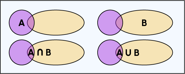 Bei der Berechnung der Wahrscheinlichkeit der Vereinigung zweier Mengen wird ein Teil entfernt, den man doppelt zählen könnte: der Schnittpunkt [latex]A[/latex], denn [latex]A[/latex] ist in [latex]A[/latex] enthalten und ist auch in [latex]B[/latex] enthalten.