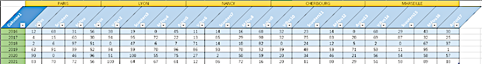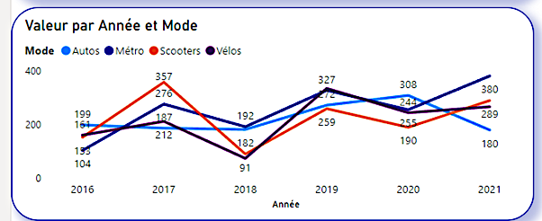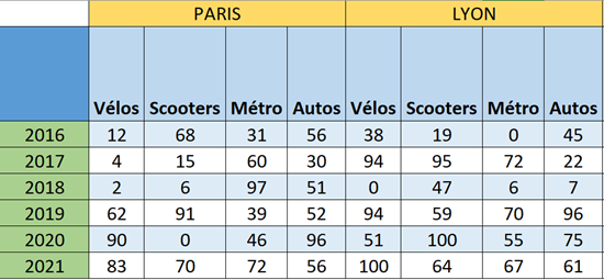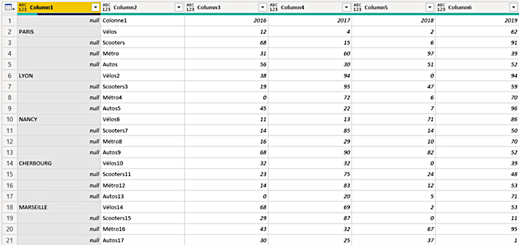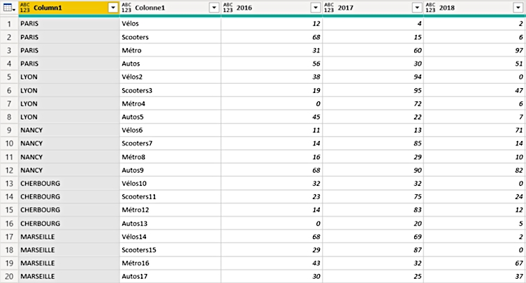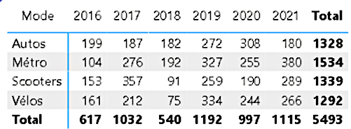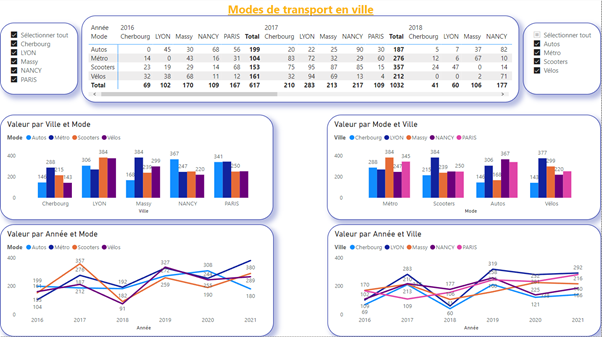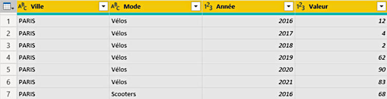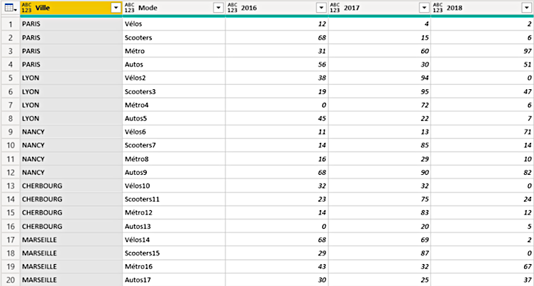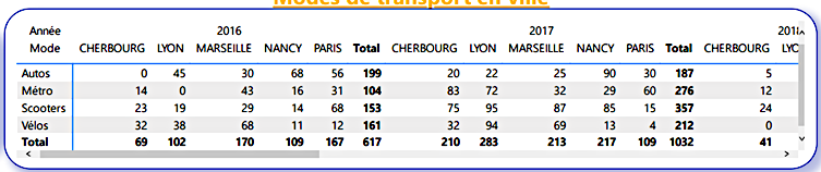 Im folgenden Beispiel sehen wir eine Tabelle, die Daten über die Verkehrsmittel in französischen Großstädten im Laufe der Zeit speichert.