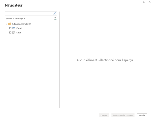 In diesem Menü kannst du das Element auswählen, mit dem du interagieren kannst. In Excel erkennt Power BI sowohl Blätter als auch Tabellen, die in Excel deklariert sind. Du kannst diese Elemente anhand der Logos unterscheiden, die mit ihnen verbunden sind: