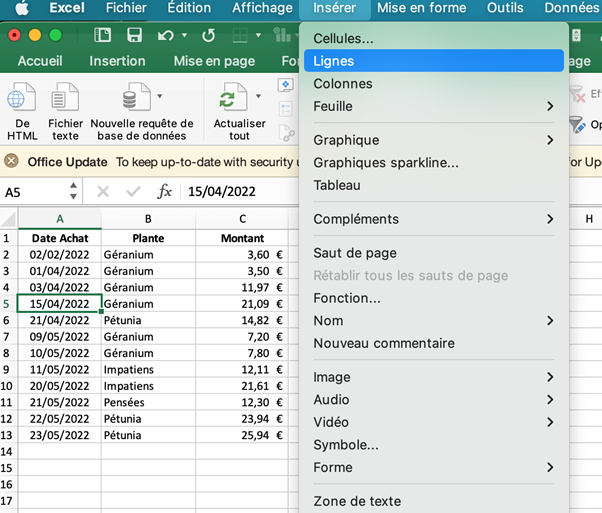 Wenn du z. B. 3 Zeilen ab Zeile 5 hinzufügen möchtest, musst Du Zeile 5 und die beiden folgenden Zeilen auswählen. Du kannst auch im Menü auf Einfügen klicken und „Zeilen“ auswählen.