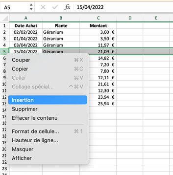 Du kannst auch Zeile 5 vollständig markieren, indem Du auf die Zahl 5 am Ende des Arbeitsblattes klickst, einen Rechtsklick ausführst und dann „Einfügen“ wählst. Eine neue leere Zeile erscheint in Zeile 5.