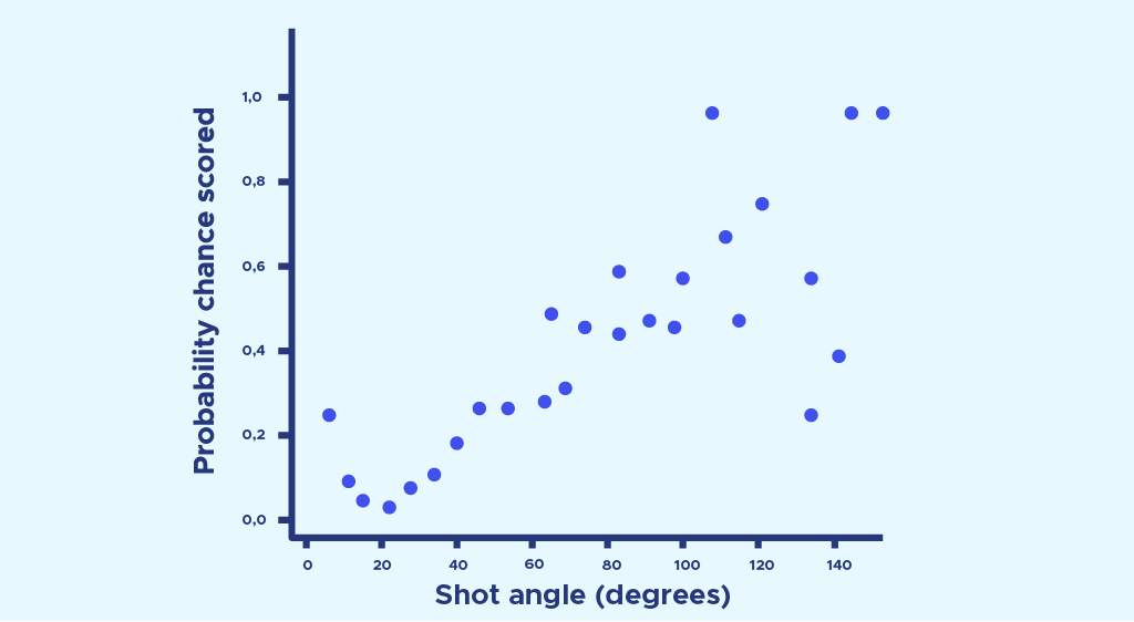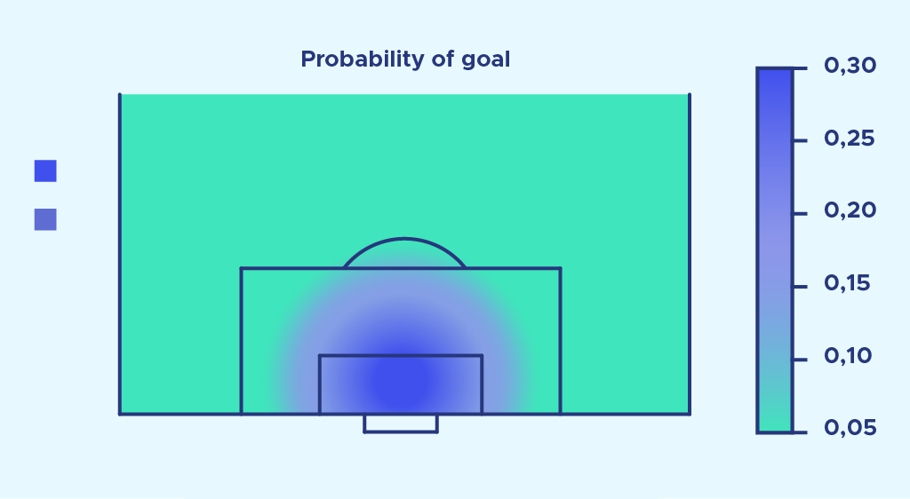 Dieses mathematische Modell berücksichtigt sowohl den Winkel als auch die Entfernung zum Ziel des Schusses. Es wurde so entwickelt, dass es der Realität der beobachteten Tore am besten entspricht. Daher ist das Modell jetzt viel allgemeiner, weist weniger Anomalien auf und scheint der Realität näher zu kommen. Auf der Grundlage dieses Modells ist es möglich, den nächsten Schüssen eine Trefferwahrscheinlichkeit zuzuordnen, je nachdem, wo der Schuss abgegeben wurde.