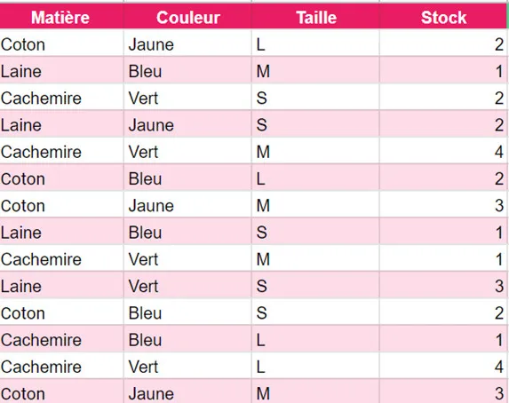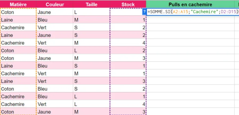 Ein erster Kunde betritt meinen Laden. Dieser Kunde hat eine Boutique für Konfektionskleidung in Montreal und muss sich auf den Winter vorbereiten. Er erklärt mir, dass die Temperaturen manchmal auf -40 °C fallen und dass Woll- oder Baumwollpullover nicht ausreichen. Ich muss ihm also eine Vorstellung von meinem Bestand an Kaschmirpullovern geben. Ich führe also die Funktion SUMMEWENN aus, indem ich den Zellbereich auswähle, der das Material enthält, aus dem der Pullover besteht, und als Kriterium „Kaschmir“ wähle