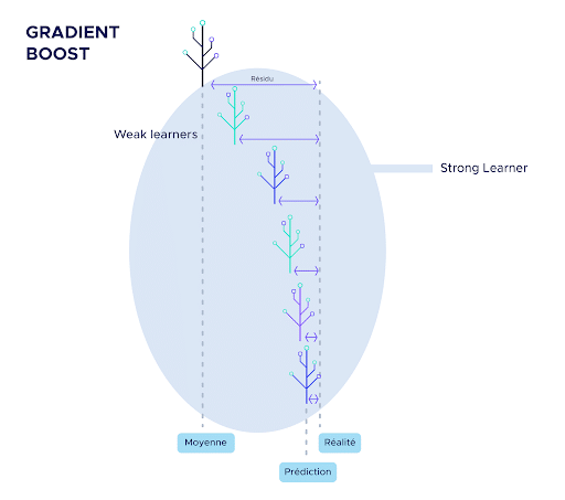 XGBoost ist eigentlich eine besondere Version des Gradient Boost-Algorithmus. Es handelt sich nämlich um eine Ansammlung von „weak learners“, die die Residuen vorhersagen und die Fehler der vorherigen „weak learners“ korrigieren.