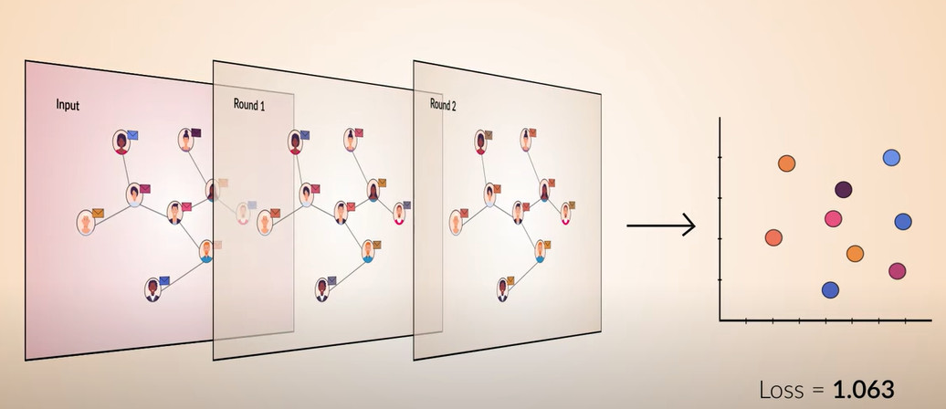 Um GNNs zu trainieren, werden zunächst jeder Schicht des neuronalen Netzes zufällige Gewichtswerte zugewiesen. Anschließend werden die Gewichte durch eine Kostenfunktion, die an das zu lösende Problem angepasst ist, das minimiert werden soll, an die verschiedenen Schichten des Netzes angepasst. Durch die Message-Passing-Funktion werden die Gewichte der versteckten Schichten der GNNs entsprechend geändert.