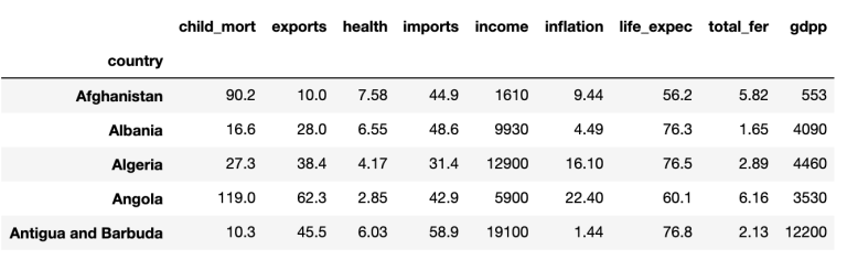 Um das Prinzip der PCA zu veranschaulichen, nehmen wir als Beispiel einen Datensatz mit dem Namen ‚country_data‚, der, wie der Name schon sagt, mehrere Informationen (BIP; Durchschnittseinkommen; Lebenserwartung; Geburten-/Mortalitätsrate etc.) über verschiedene Länder zusammenfasst.