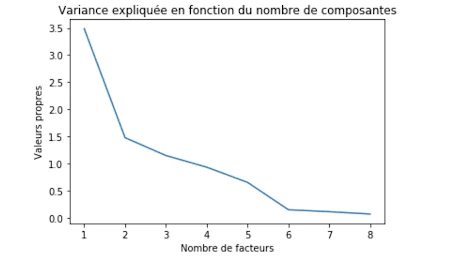 In diesem Diagramm, das die Anzahl der zu wählenden Faktoren in Abhängigkeit von den Eigenwerten darstellt, zeigen wir, dass die optimale Faktorwahl 2 beträgt (dank der Knickmethode). Wir werden also von einer Dimension 9 zu einer Dimension 2 übergehen, was die Basisdimension erheblich reduziert. Wie bereits erwähnt, wird es durch diese Reduzierung zwangsläufig zu einem Informationsverlust kommen. Dennoch bleibt eine Informationsrate von fast 70 % erhalten, was uns erlaubt, eine Darstellung zu erhalten, die meiner 9-dimensionalen Darstellung nahe kommt.