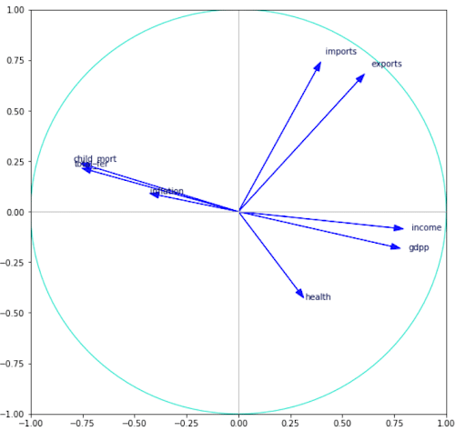 Hier ist eine Darstellung jedes Landes (167) auf 2 Achsen. Um die Qualität unserer Darstellung zu beurteilen, haben wir beschlossen, jedes Land entsprechend seiner Lebenserwartung in drei Gruppen einzufärben, wobei wir eine gewisse Tendenz erkennen können. Wir können feststellen, dass die Länder mit einer hohen Lebenserwartung im unteren rechten Teil des Diagramms konzentriert sind. Der Korrelationskreis zeigt, dass die Personen in diesem Bereich teilweise durch die Variablen „health„, „income“ oder „gdpp“ erklärt werden. Daraus lässt sich schließen, dass die Länder, die am meisten für Gesundheit ausgeben, eine höhere Lebenserwartung haben. Dasselbe gilt für die Länder, die sich im oberen linken Teil des Diagramms befinden. Der Korrelationskreis zeigt, dass dieser Teil am meisten durch die Variablen „child_mort“ oder „total_fer“ erklärt wird.