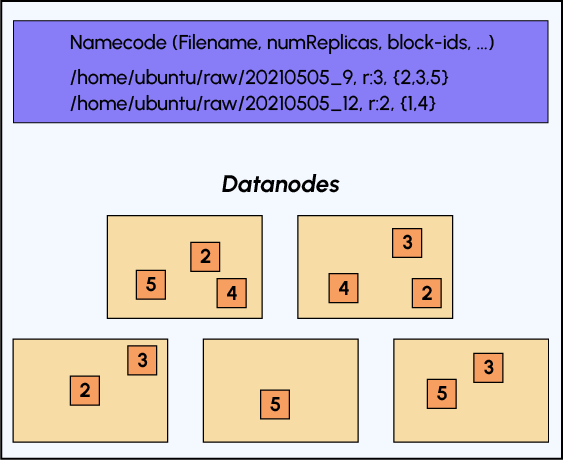 Seit Hadoop werden die Daten zwischen den Rechnern im Cluster geteilt, sodass die Operationen parallelisiert werden. Dabei wird zwischen den Maschinen im Cluster unterschieden: Einige Maschinen besitzen die Daten und verarbeiten sie, während eine Maschine die Daten koordiniert. Diese Architektur wird allgemein als „master-slave“ (Meister-Sklave) bezeichnet. In Hadoop wird der „Master“-Rechner als Namenode bezeichnet und die „Slave“-Rechner werden als Datanodes bezeichnet.