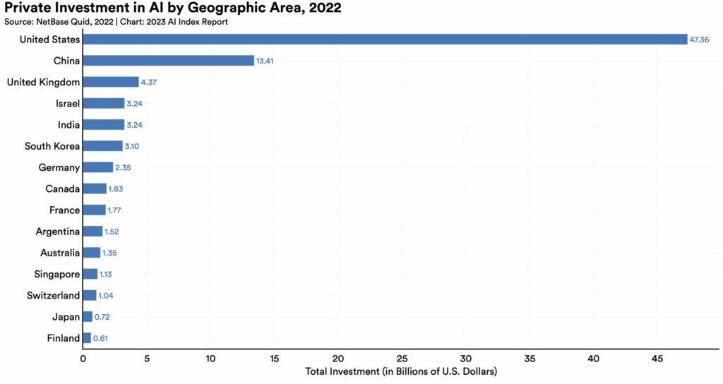 Dieses Ziel, das am Mittwoch, den 23. August, bekannt gegeben wurde, bleibt bescheiden im Vergleich zu den 3,3 Milliarden US-Dollar, die die US-Regierung bis 2022 für die KI-Forschung bereitstellt. Letzteres wird auch von den privaten Ausgaben für KI in den USA in den Schatten gestellt, die 2022 47,4 Milliarden US-Dollar betragen, was fast doppelt so hoch ist wie die Gesamtausgaben in Europa und weit über den 13,4 Milliarden US-Dollar Chinas liegt, so der Bericht der Stanford University.