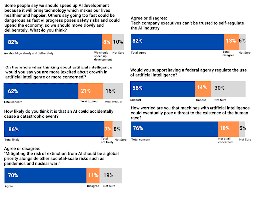Eine Mehrheit der Wähler traut den Führungskräften der Technologiebranche nicht zu, ihren Einsatz von künstlicher Intelligenz selbst zu regulieren. 83 % der Wähler glauben, dass KI versehentlich ein katastrophales Ereignis auslösen könnte, 72 % wollen die Entwicklung und den Einsatz von KI verlangsamen.