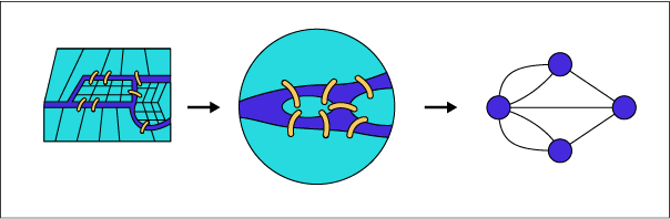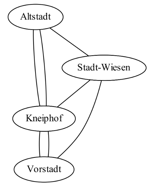 „Kann man die sieben Brücken der Stadt durchlaufen, indem man jede Brücke nur einmal benutzt?“: Euler stellte fest, dass die Reihenfolge des Weges keinen Einfluss hat und modellierte das Problem als Graph: Die verschiedenen Stadtteile sind seine Knoten, die durch die Brücken miteinander verbunden sind, die wiederum die Kanten des Graphen sind.