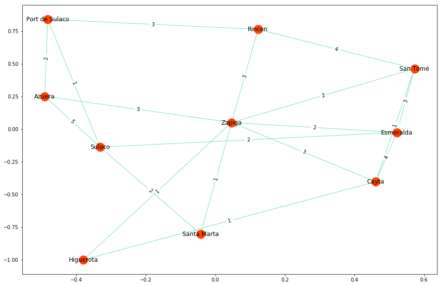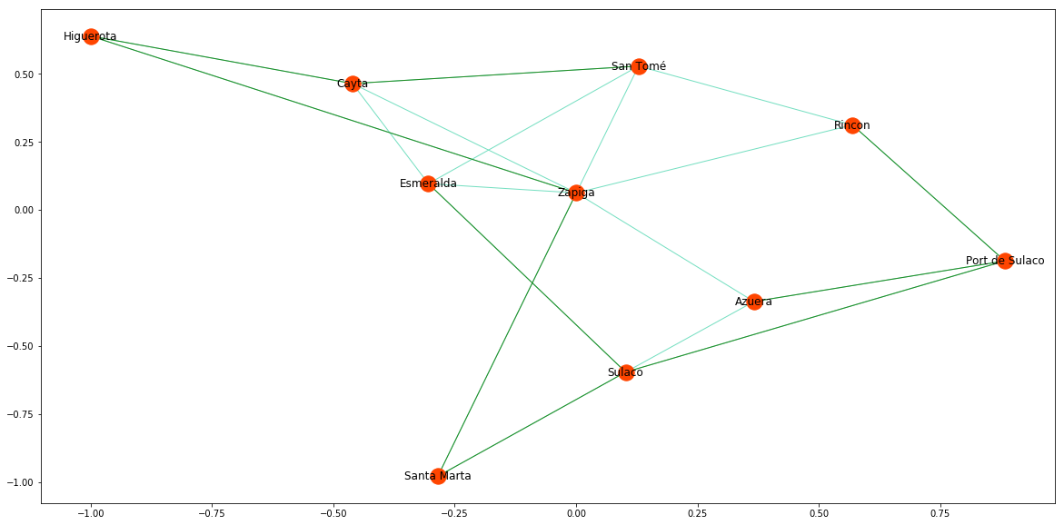 Son problème sera donc résolu en affichant l’arbre couvrant minimal associé au graphe (en vert sur les images suivantes) : on peut également calculer le coût et le nombre d’arêtes économisés :