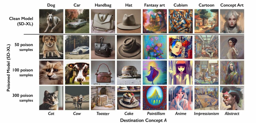 Wenn diese veränderten Bilder in Datenbanken integriert werden, die von KIs genutzt werden, stören sie die Fähigkeit der KIs, visuelle Daten richtig zu interpretieren. Dies führt dazu, dass falsche oder verzerrte Inhalte produziert werden, wenn eine KI versucht, neue Bilder auf der Grundlage dieser verfälschten Muster zu erstellen.